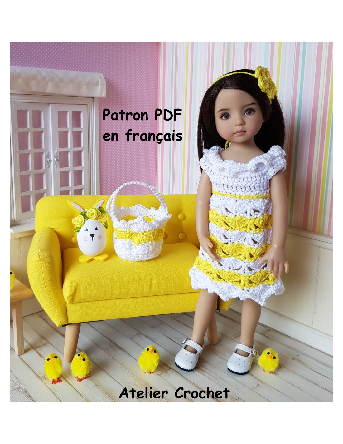robe , serre-tête et panier patron PDF de crochet pour poupée Little Darling
