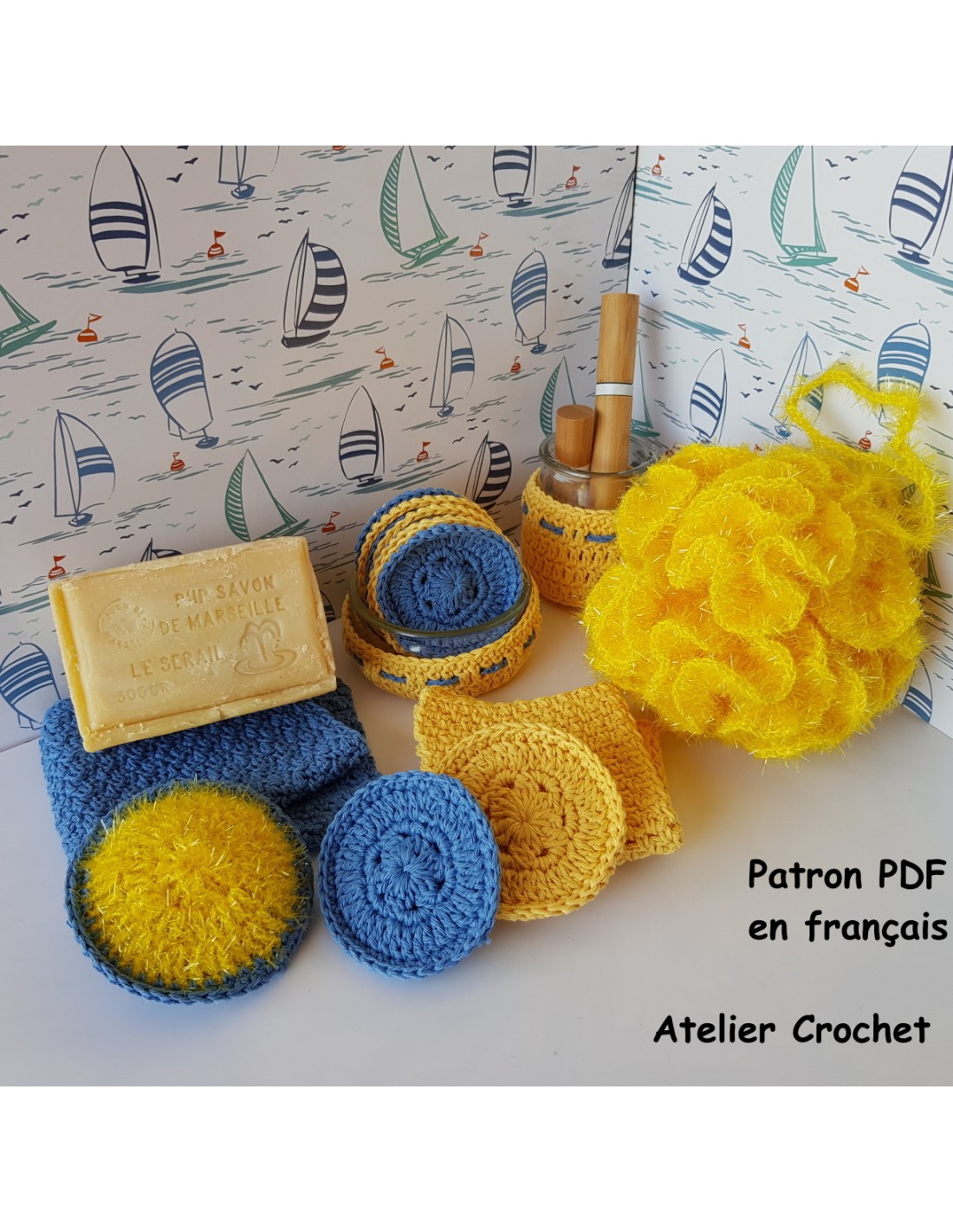 Vous achetez un fichier PDF contenant les explications de l’ensemble : lingettes, pot à lingettes, pot à cosmétique, éponge exfoliante, fleur de douche, lavettes.